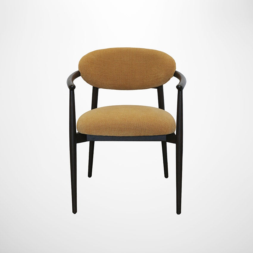 Bring effortless sophistication to your dining space with the Baltimore Dining Chair with Arms. Defined by its clean, mid-century–inspired silhouette, this piece balances refined simplicity with everyday comfort. A gently curved backrest flows seamlessly into supportive armrests, creating an inviting seat that encourages long, relaxed dining. Upholstered in an uplifting gold chenille fabric that mimics the look of linen yet is easy to care for. The generously cushioned seat offers a luxurious feel, while the solid timber frame provides durability and a warm, natural contrast.